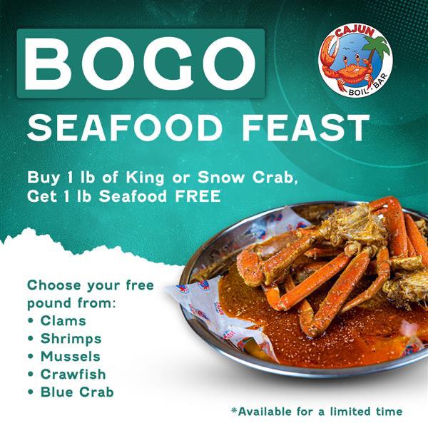 - Buy 1 lb of King or Snow Crab, Get 1 lb Seafood Free